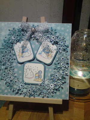 Week 24 and the theme is embossing. So I thought I'll have a go at embossing using powder and the heat gun. Hardly ever do this kind of embossing these days. I used a versamark ink pad and Silver embossing powder. The stamp is one of my all time favorite stamps by Penny Black. Love the face on the last snowman. It is a long stamp but I have cut into three. Then I mounted them on to blue bazzill. The paper on the background is one I bought last week from http://www.craftden.co.uk/ it's a Bo bunny Christmas papers, it's embossed with beautiful snowflakes. Then I have cut Martha Stewart snowflakes in two different blue bazzill cards, and some out of the Bo bunny paper. I have used them to make a wreath, added gems and Bo bunny spotty organza ribbon, with a pearl brad in the middle. I got the idea for the wreath from the latest magnolia Magazine. Everything I have used is available from Craft Den. Hope you like it. Love Sandra x